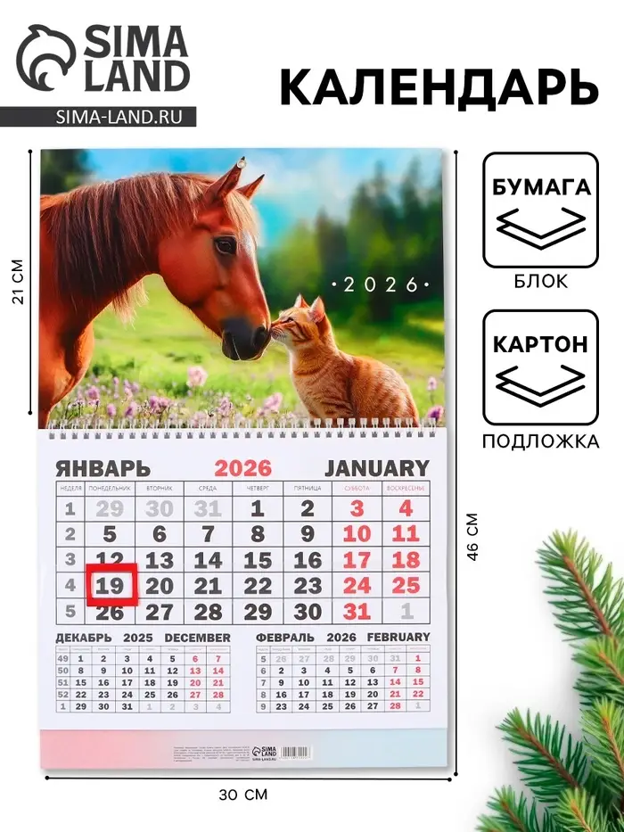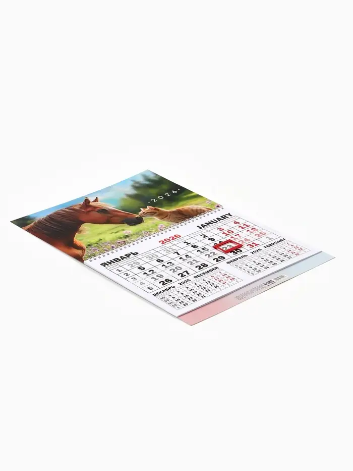 Календарь настенный квартальный 2026 «Лошадь с котенком», 30×46 см