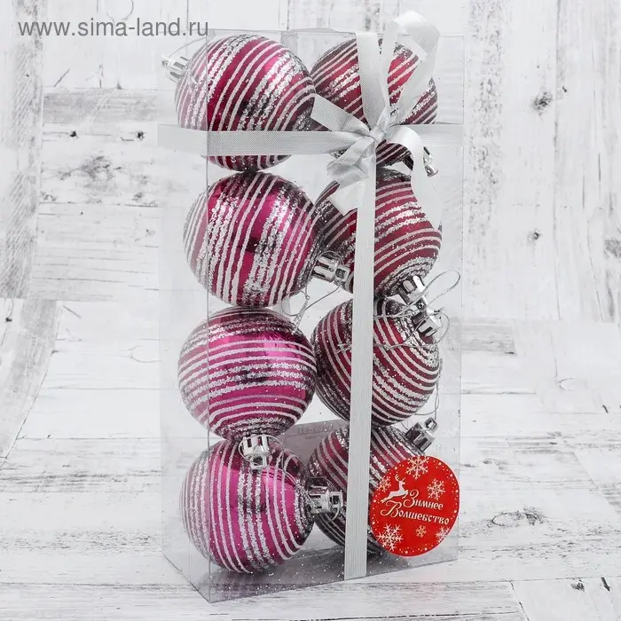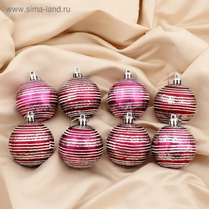 - Комплект из 8 шаров с декоративным рисунком насыщенного бордового оттенка.