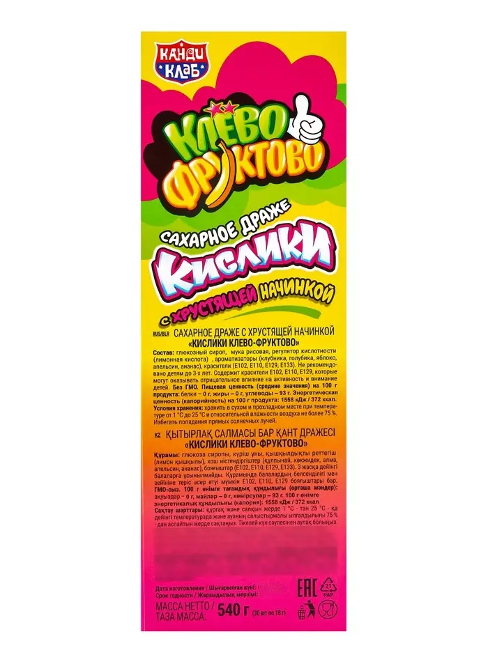 Драже сахарное с хрустящей начинкой «Кислики Клево-Фруктово», 18 г