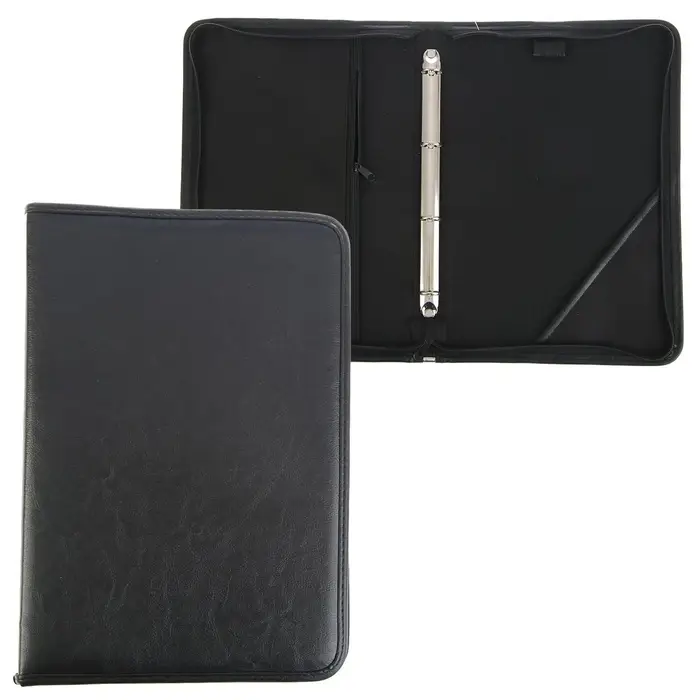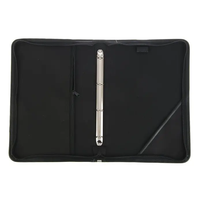 Эта деловая папка из искусственной кожи с кольцевым механизмом — инструмент для систематизации документов в офисе или на переговорах. Формат А4 вмещает листы любого стандарта, включая плотные бланки. Четырёхкольцевой механизм надёжно фиксирует бумаги, исключая их выпадение. Жёсткий каркас защищает содержимое от деформации при транспортировке. Молния по периметру обеспечивает полную изоляцию от внешней среды. Внутренний карман предназначен для визиток, ручек или флеш-накопителей. Строгий чёрный цвет без рисунка соответствует деловому этикету.