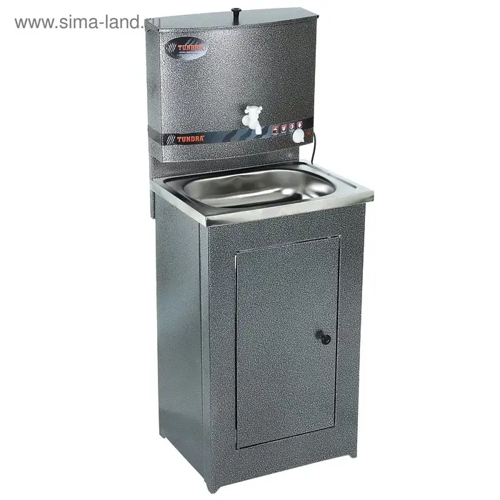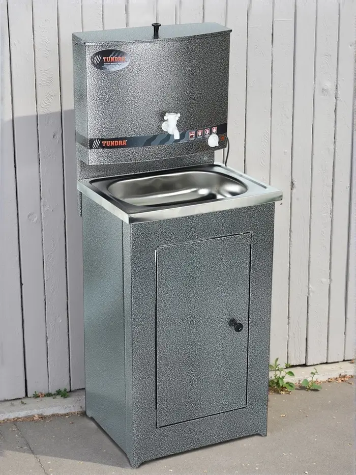 Умывальник TUNDRA — отличное приобретение для дачи, гаража, мастерской или других мест без центрального водоснабжения. Металлическая конструкция серебряного цвета проста в эксплуатации и уходе, обладает высокой износоустойчивостью. Раковина выполнена из нержавеющей стали, а на бак для воды нанесено запатентованное устойчивое к коррозии покрытие. Огромное преимущество — наличие встроенного водонагревателя, который будет особенно актуален в прохладную погоду.