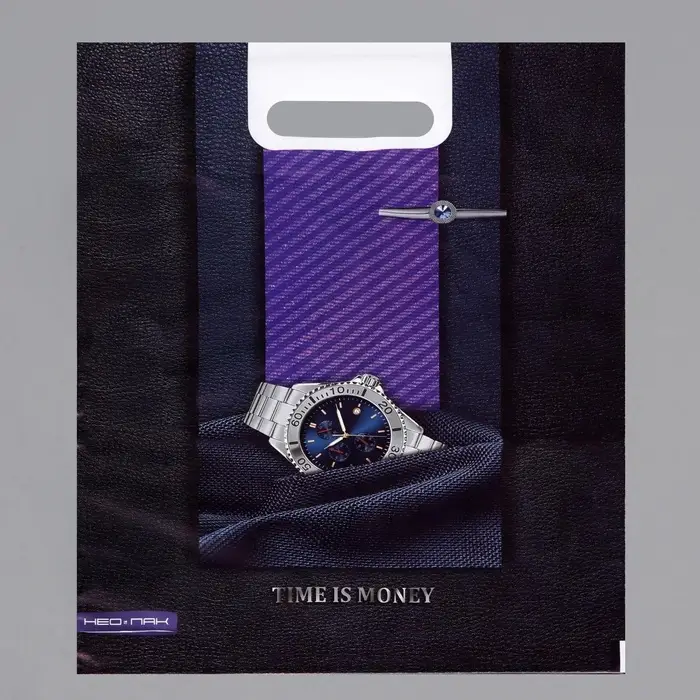 Стиль, который ценит время! Пакет «Время» с вырубной ручкой — это солидная упаковка с тематическим дизайном для ценителей лаконичности. Сочетание повышенной плотности и строгого оформления делает его практичным выбором для деловых подарков.