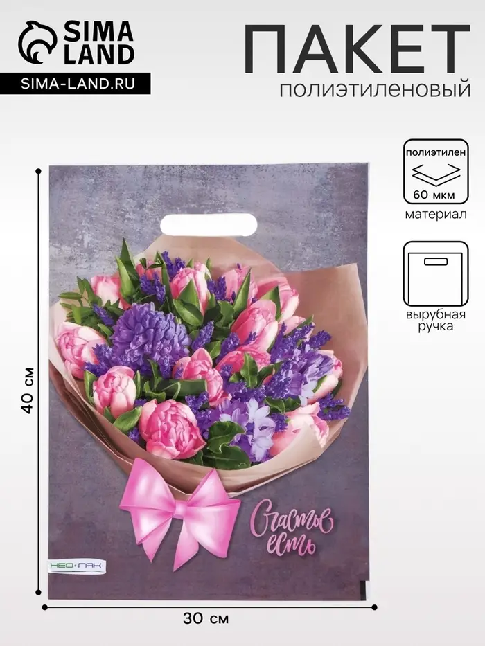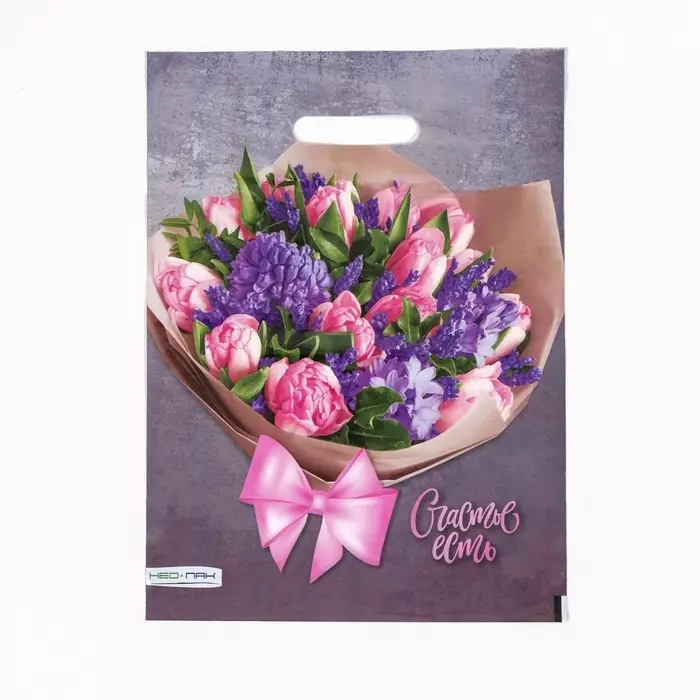- Позитивный дизайн для особых occasion: Яркая цветочная композиция и надпись «Счастье есть» делают пакет идеальным решением для подарков на 8 Марта, день рождения или без повода. Универсальная тематика подходит женщинам и мужчинам.