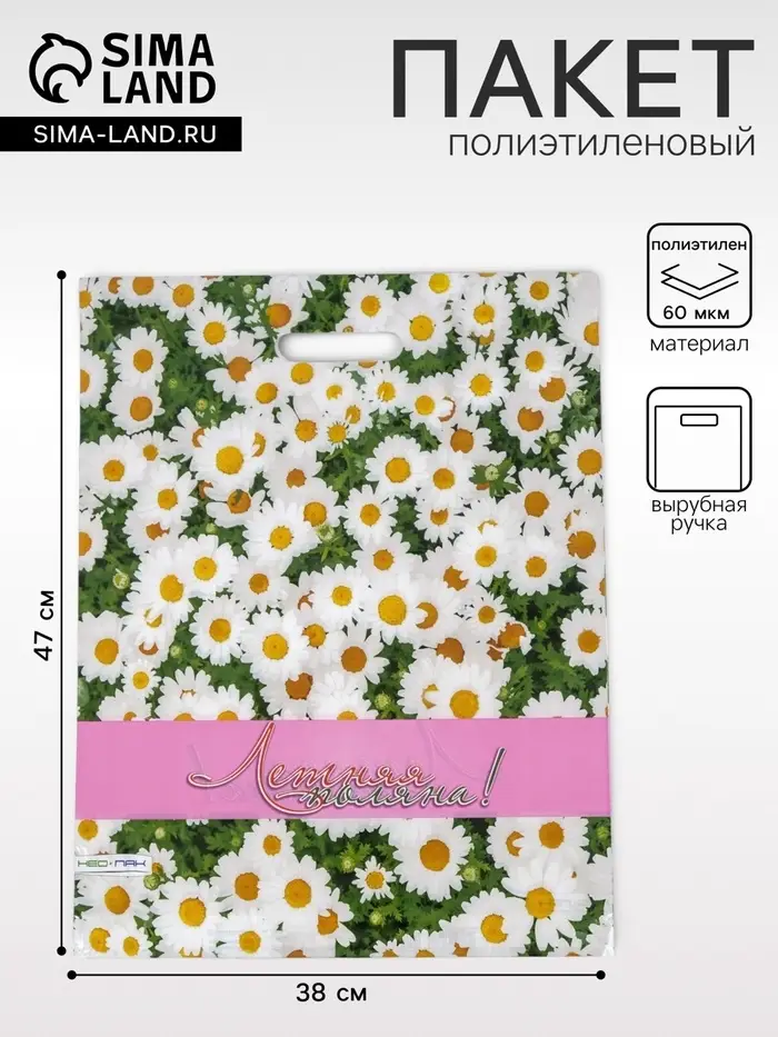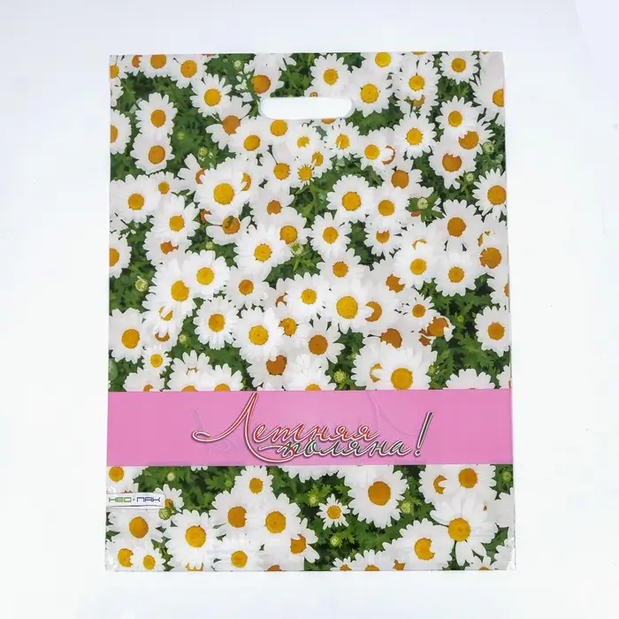 - Сочный летний дизайн: Яркие полевые цветы на зелёном фоне создают настроение летнего луга. Такой пакет особенно уместен для подарков на 8 Марта, дни рождения или пикники.