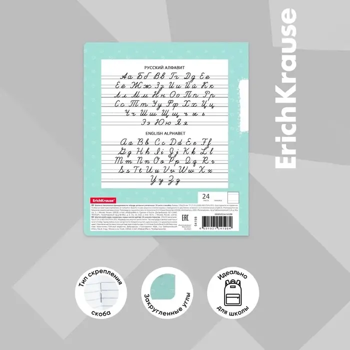 Тетрадь школьная ученическая формата А5+ (170х203 мм). Обложка из высококачественного мелованного картона плотностью 180 г/м2. В блоке 24 листа в линейку с полями. Бумага офсетная плотностью 60 г/м2. Цвет линовки - синий. Скругленные уголки обложки и блока. Тип скрепления - скоба. Тетради упакованы в термоусадочную пленку по 10 штук.