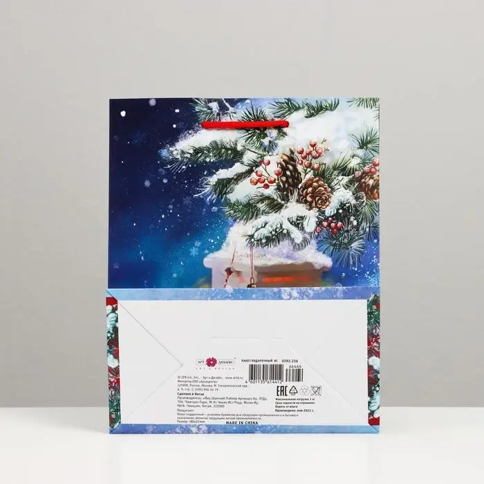 Пакет подарочный новогодний с широким дном «Снегири», 20 х 14 х 13.2 см, Новый год