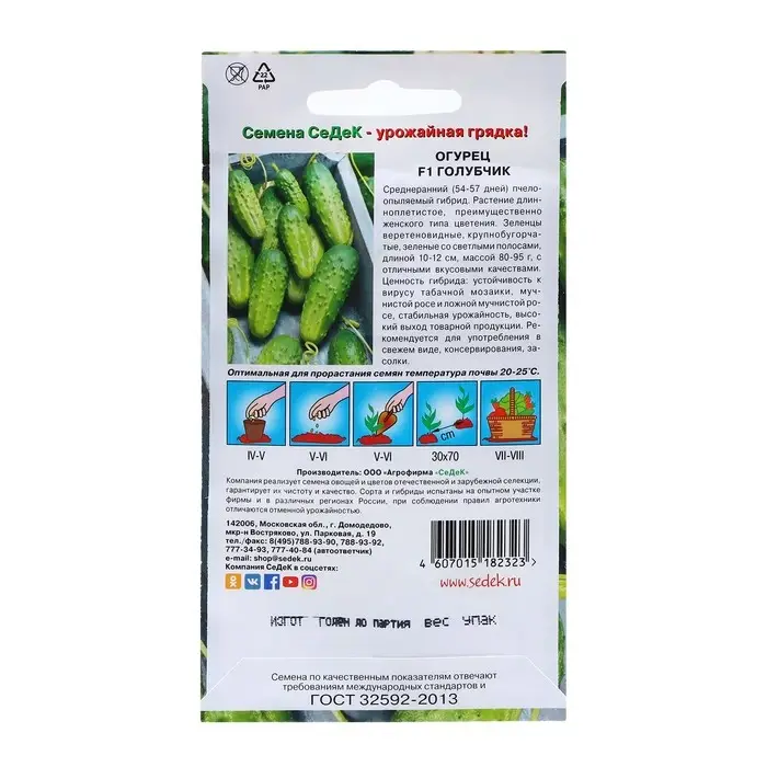 Скороспелый (42-45 дней от посева до плодоношения) пчелоопыляемый гибрид, предназначен для выращивания в открытом грунте и под временными пленочными укрытиями. Растение сильнорослое, длина главного стебля - 140-190 см. Зеленец овально-цилиндрический, зеленый с размытыми светлыми полосами до 1/3 длины, крупнобугорчатый с редким расположением бугорков. Опушение сложное, черное. Длина плода 9-12 см, масса 80-95 г. Мякоть хрустящая, без горечи. Характеризуется комплексной устойчивостью к болезням. Посев на рассаду в начале мая. Высадка в грунт в конце мая - начале июня в фазе двух-трех настоящих листьев. Посев в открытый грунт проводится в конце мая - начале июня. Схема посадки 40х40 см.
