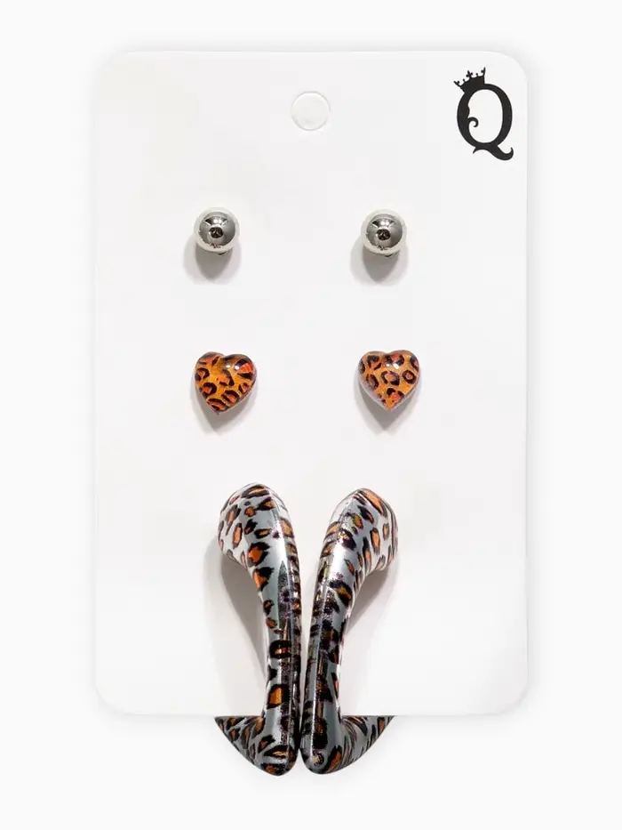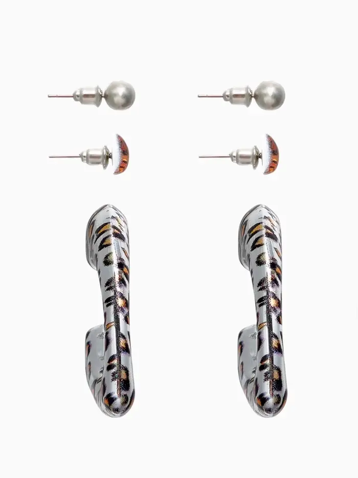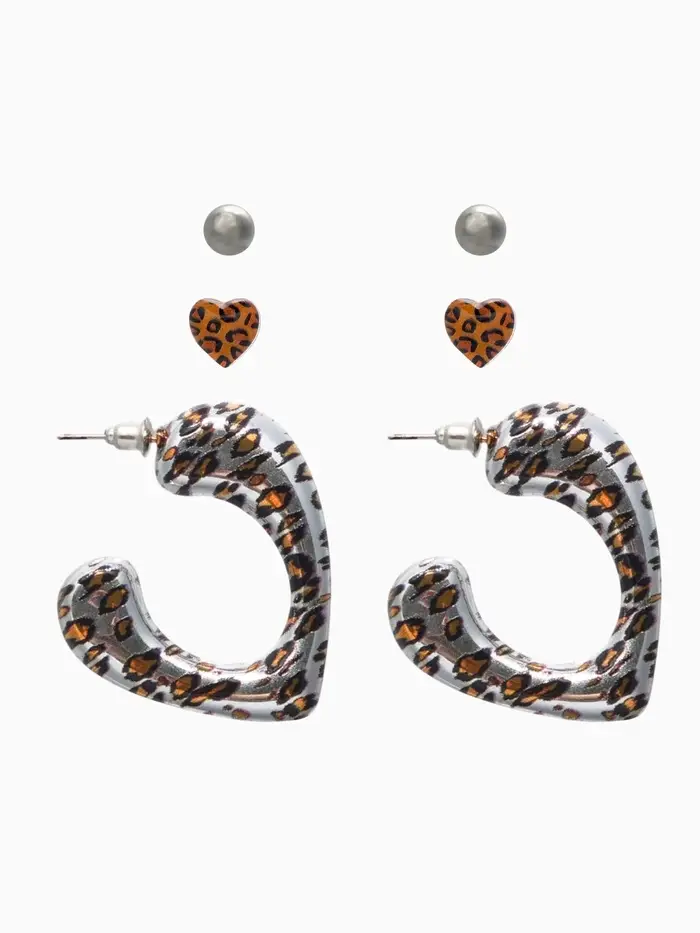 Погрузитесь в мир стиля и оригинальности с набором серьг, который станет ярким акцентом в вашем образе. Этот комплект из трёх пар украшений с леопардовым принтом и сердечками выполнен в серебристом цвете, что придаёт ему элегантный и современный вид.