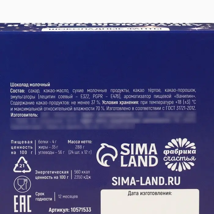 Состав: сахар, какао - масло, сухие молочные продукты, какао тёртое, какао - порошок, эмульгаторы (лецитин соевый - Е322, PGPR - Е476), ароматизатор пищевой "Ванилин". Содержание какао-продуктов: не менее 37 %.