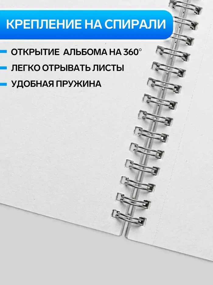 - Спиральное крепление дает возможность полностью разворачивать альбом для работы с разворотами.