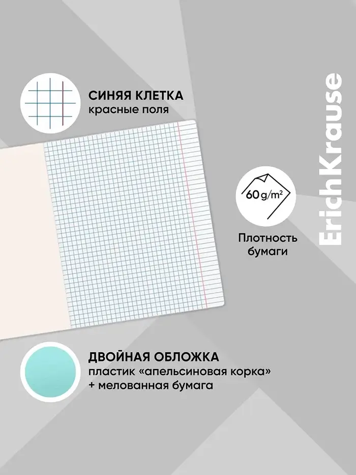 Тетрадь школьная ученическая формата А5+ (170x203 мм). Двойная обложка: внешняя выполнена из высококачественного износостойкого цветного пластика с фактурой "апельсиновая корка", внутренняя - из офсетной бумаги.