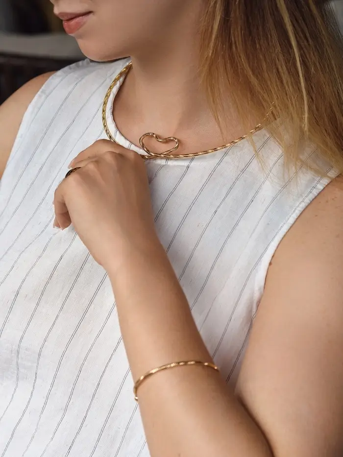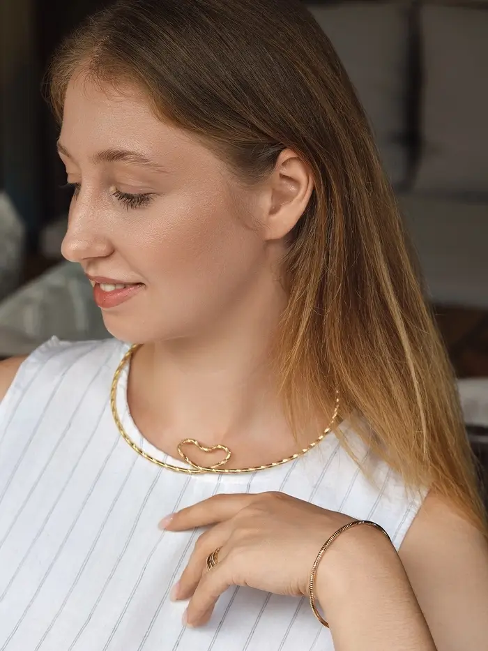 Изысканный комплект, включающий чокер и браслет в золотистом исполнении, станет эффектным акцентом вашего образа. Лаконичные формы в виде сердца без вставок подчёркивают утончённость и современный стиль, позволяя легко сочетать украшения с разной одеждой — от повседневных ансамблей до вечерних выходов.