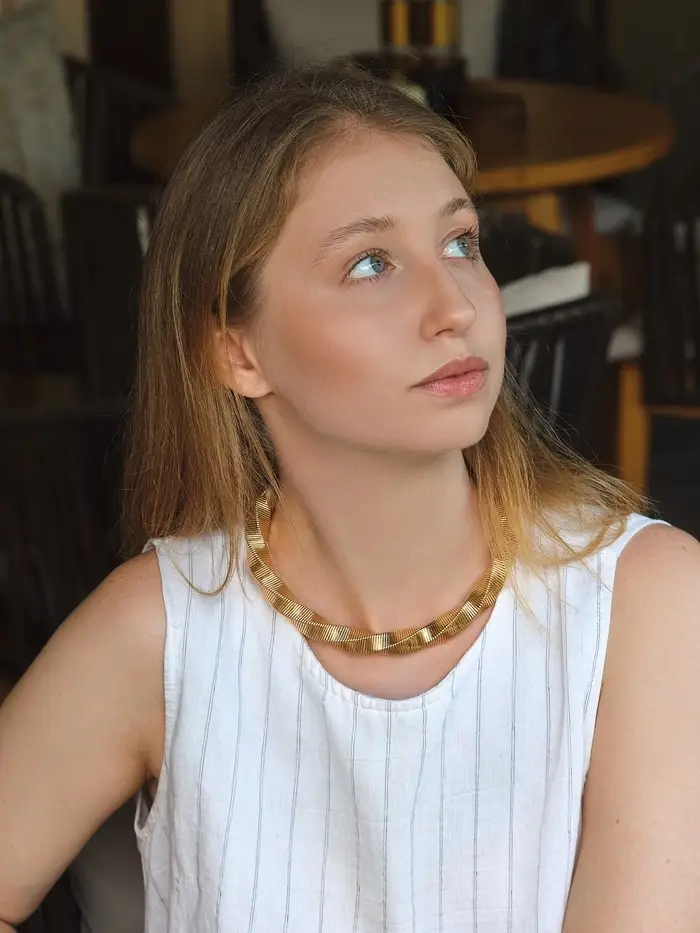 Этот золотистый чокер — отличный выбор для женщин, которые ценят лаконичность, но не готовы жертвовать выразительностью. Он добавит вашему образу утончённости и современного шика, подчёркивая вашу естественную красоту.