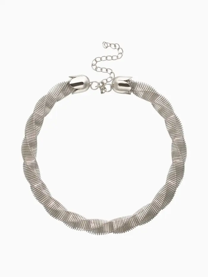Серебристый чокер d=15 см с кручёным плетением — это изысканный аксессуар, который сочетает в себе минимализм и выразительность. Тонкая металлическая цепь с оригинальной текстурой создаёт эффект лёгкого мерцания, подчёркивая грациозность и стильность образа без лишних деталей.
