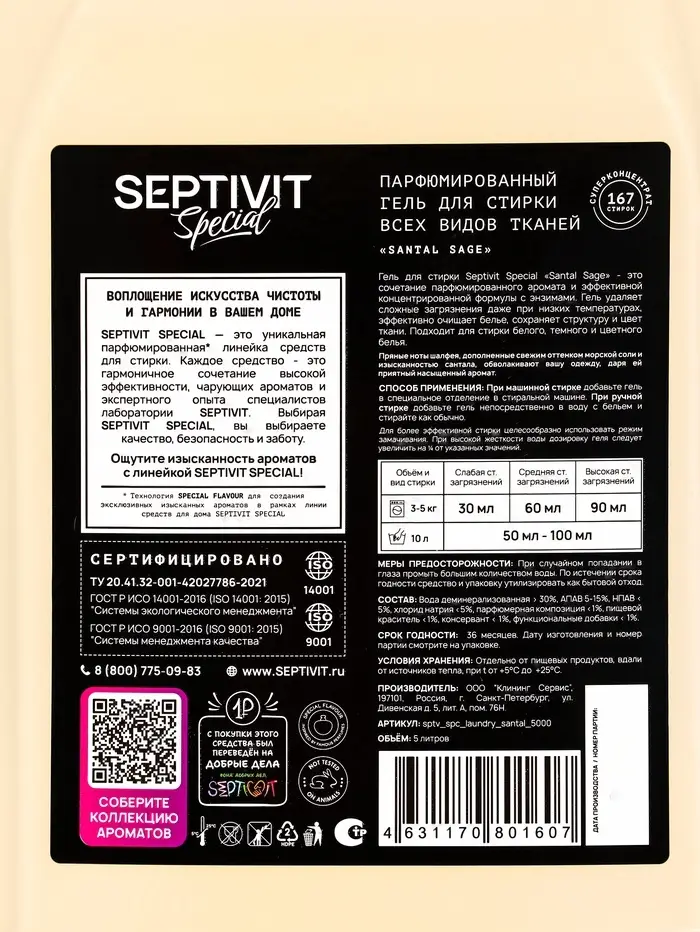 Гель для стирки Septivit Special "Santal Sage", 5л