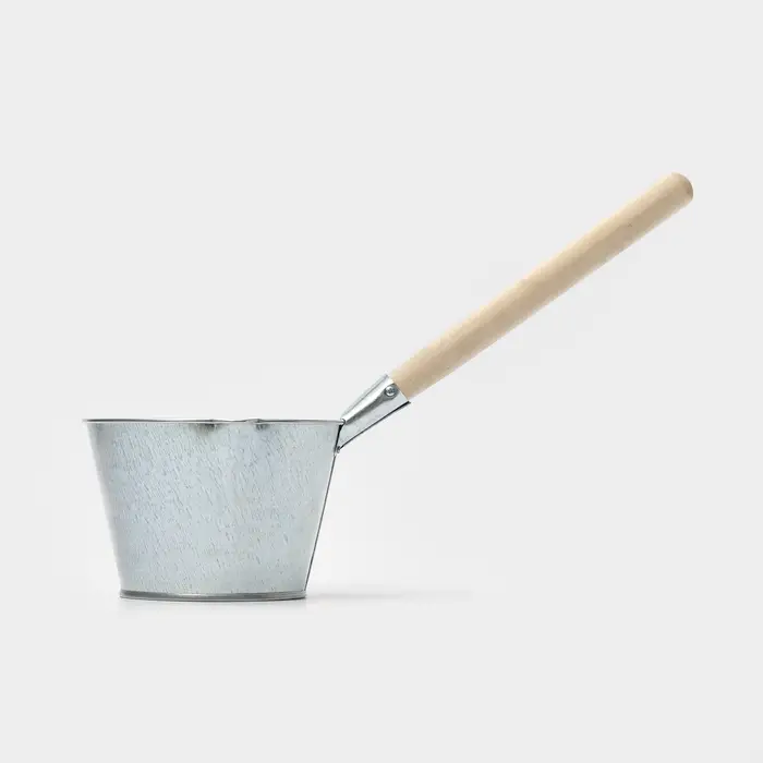 Оцинкованный ковш прекрасно впишется в оформление бани, где присутствует и дерево и сталь. Изготовлен из оцинкованной стали. Ему не страшен постоянный контакт с холодной и горячей водой.