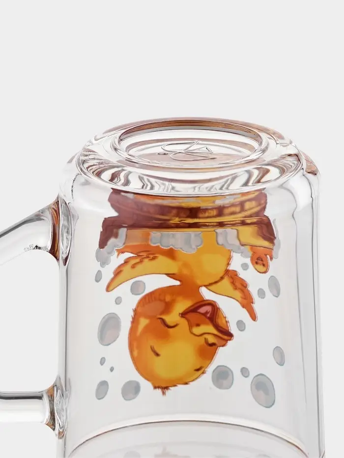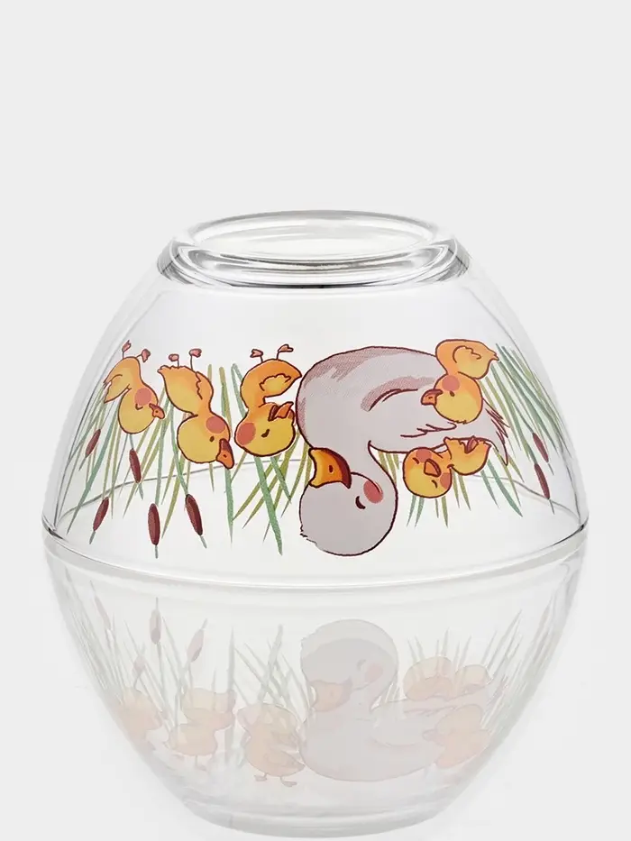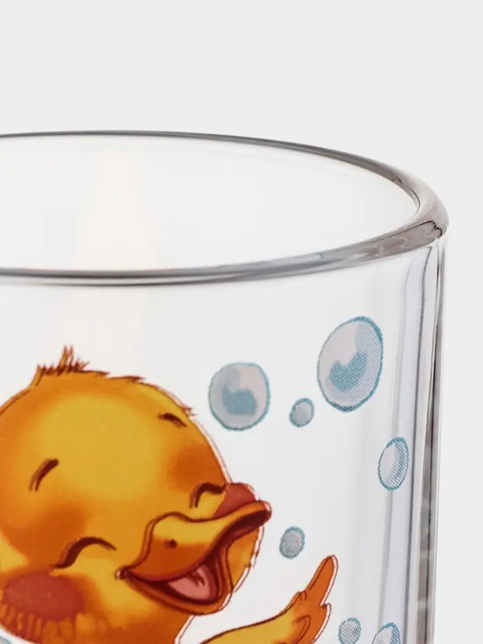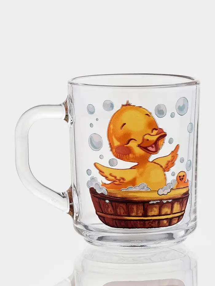 - Рисунок, который радует: декор с изображением утят на прозрачном фоне добавляет игривости. Жёлтые птички словно плавают в воде — такой эффект создаёт прозрачное стекло. Тематика «животный мир» особенно нравится детям и поднимает настроение взрослым.