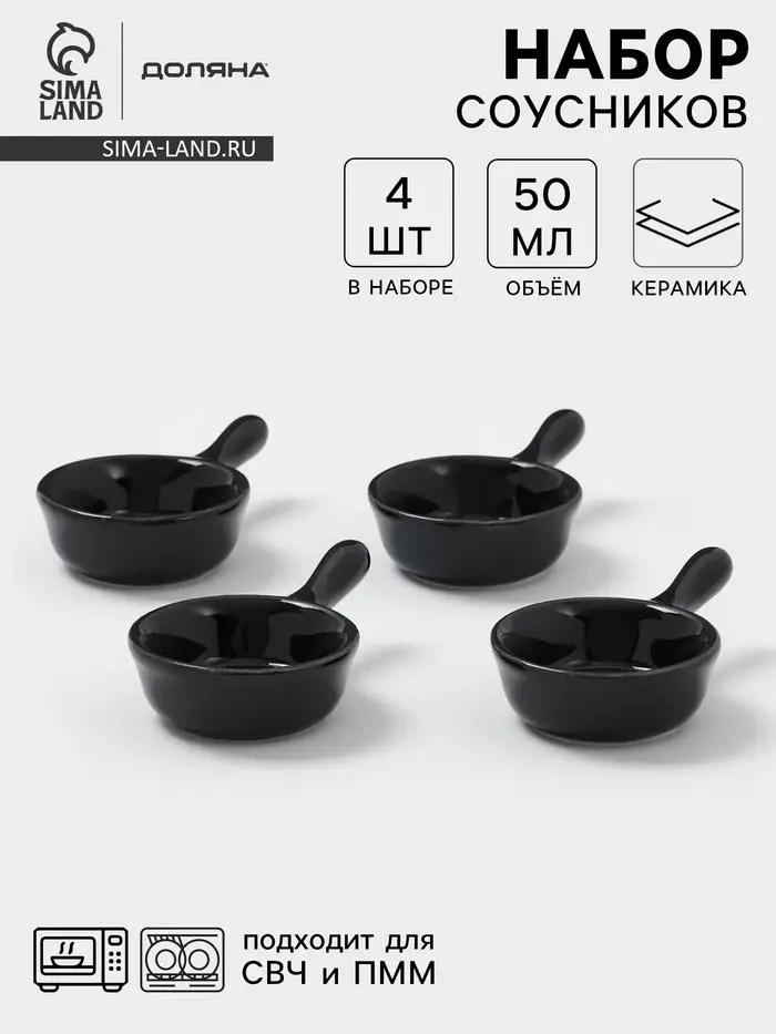 Соусники с ручкой Доляна «Классика», набор 4 шт., 50 мл, керамика, чёрный
