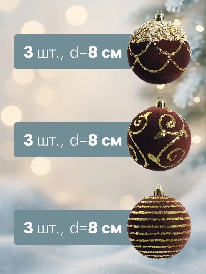 Набор коричневых ёлочных шаров с бархатистой текстурой и изящным узором завитков добавит тёплых оттенков в праздничное оформление. Диаметр 8 см делает украшения заметными, но не громоздкими, что позволяет гармонично вписать их в любой новогодний декор.