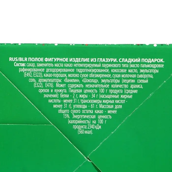 Пищевая ценность 100 г продукта (средние значения): белки - 2 г, жиры- 34 г (насыщенные жирные кислоты - менее 31 г, трансизомеры жирных кислот - менее 31 г) углеводы - 61 г. Массовая доля общего сухого остатка какао - менее 15%. Энергетическая ценность (калорийность) на 100 г продукта: 2340 кДж (560 Ккал).
