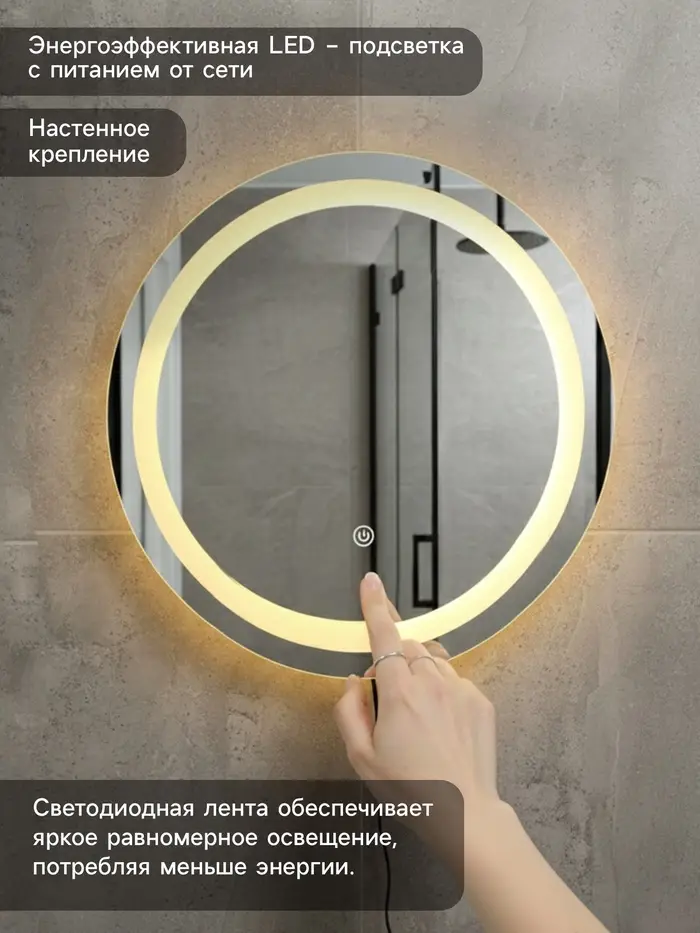 Зеркало интерьерное настенное, с подсветкой, с сенсорной кнопкой, 60×60 см