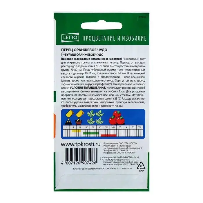 Высокое содержание витаминов и каротина! Раннеспелый сорт для открытого грунта и пленочных теплиц. Период от высадки рассады до плодоношения 70-75 дней. Высота растения в открытом грунте 70-80 см. Плод кубовидной формы, трех-четырехгранный, высота и диаметр 10-11 см, толщина стенок 5-7 мм. В технической спелости окраска зеленая, в биологической ярко-оранжевая. Мякоть ароматная, великолепного вкуса. Сорт устойчив к вирусу табачной мозаики, вирусу картофеля (Y). Универсальное использование.