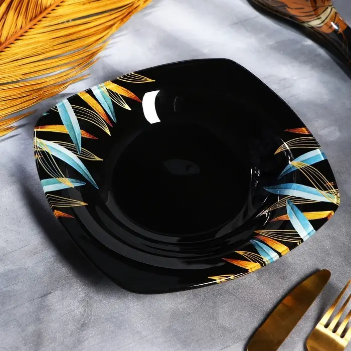 - Современный дизайн: тарелка выполнена в чёрном цвете с золотыми тропическими листьями, что придаёт ей роскошный вид;