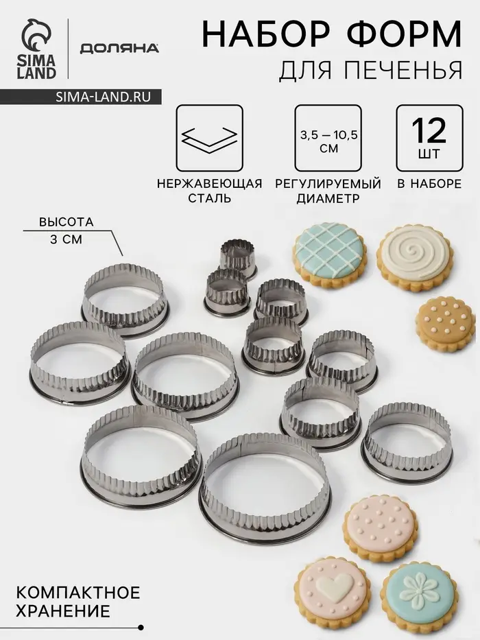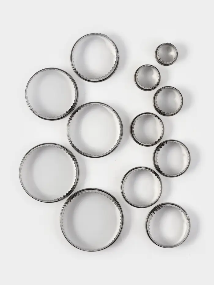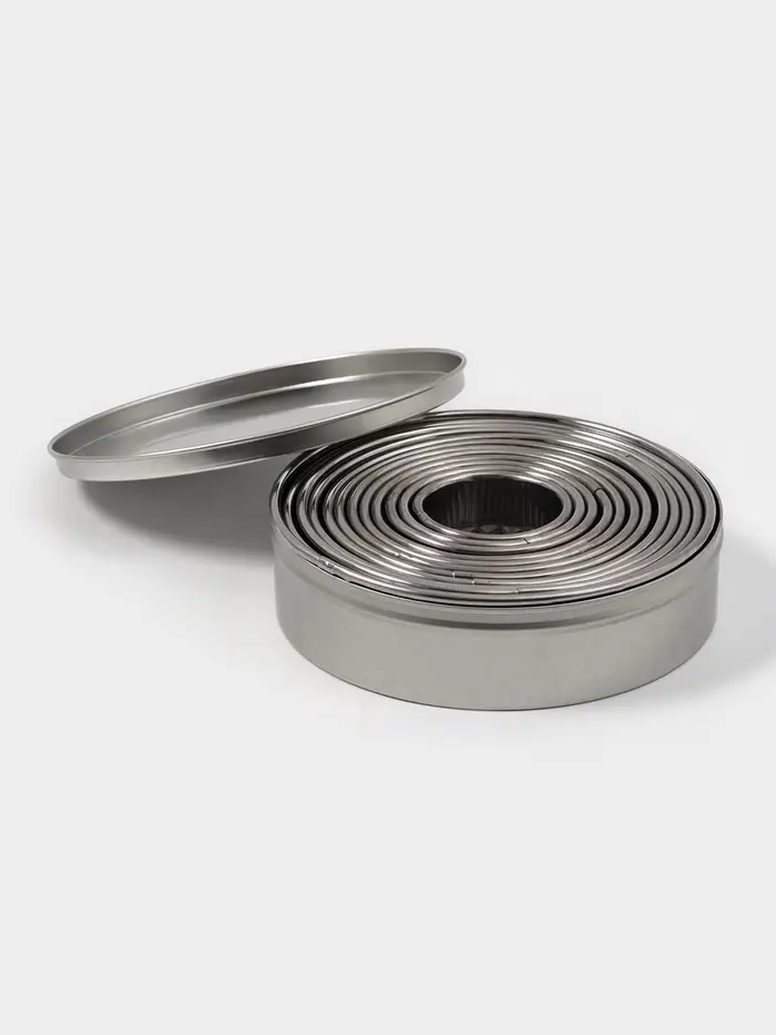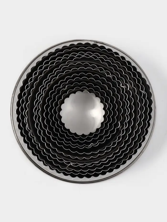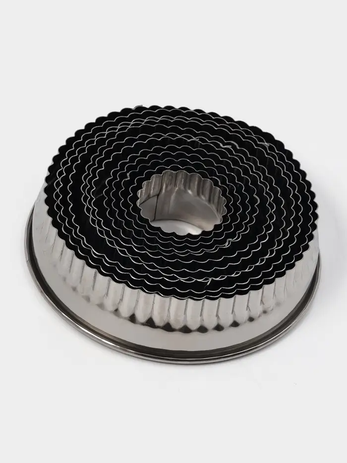 Этот набор металлических форм для выпечки помогает создавать аккуратные печенья с волнистыми краями. Двенадцать круглых формочек из нержавеющей стали охватывают диаметры от 3.5 до 10.5 см, подходя для разных видов теста. Высота бортика 3 см удобна для работы с песочным, сахарным и овсяным тестом.
