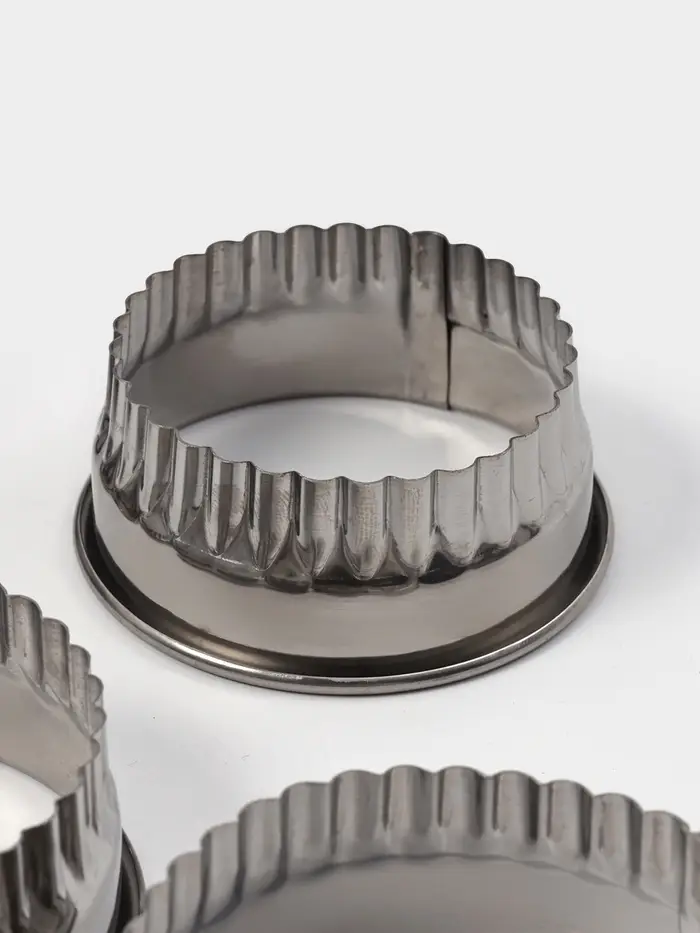 Тонкий металл не требует сильного нажатия при работе даже с холодным масляным тестом. Формы сохраняют геометрию при падении на твёрдые поверхности. Набор подходит для выпечки, формирования кремовых десертов и создания фруктовых нарезок с ровными краями. Металл не впитывает запахи и жиры после многократного использования.