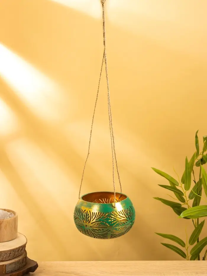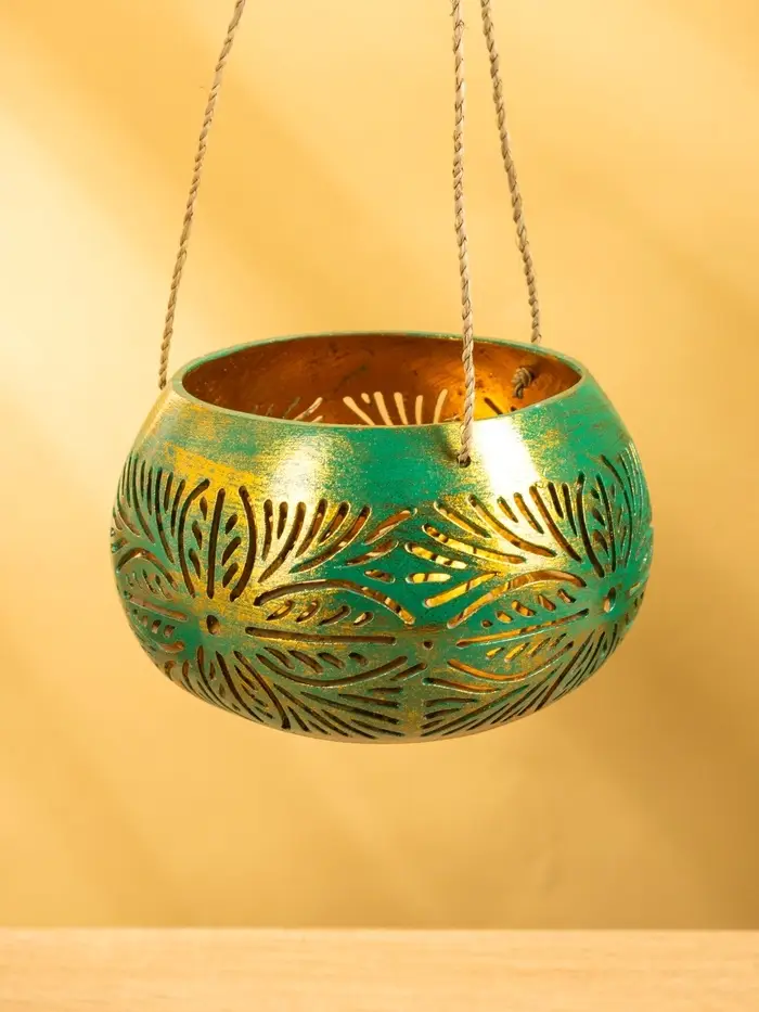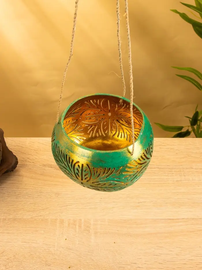 Подсвечник подвесной из кокоса, 14×14×10 см, голубой с золотым