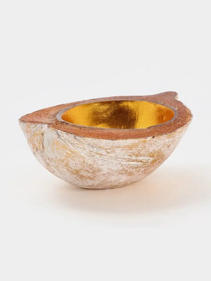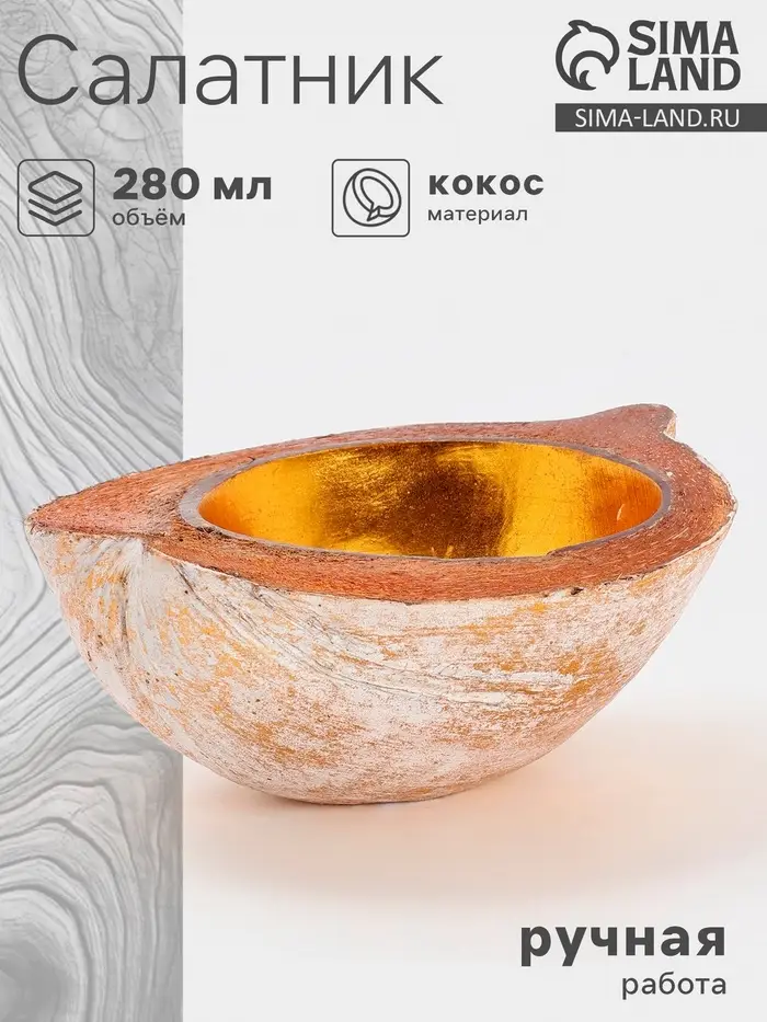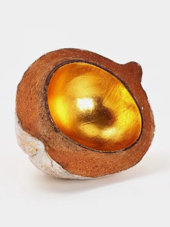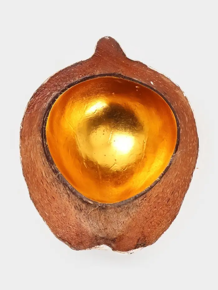 Чаша из кокоса — изысканное изделие ручной работы в нежной бежево-золотой гамме. Изготовлена из цельного кокоса с сохранением естественного рельефа скорлупы. Фигурная форма и благородное золотое покрытие придают особый шарм. Не подходит для СВЧ и посудомоечной машины.
