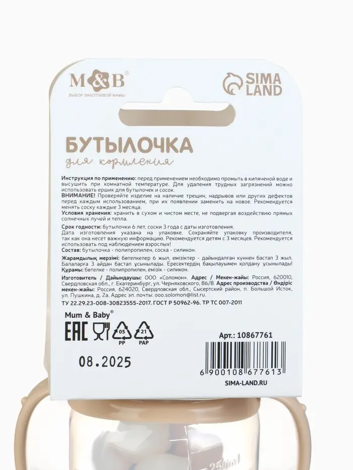 Бутылочка для кормления «Baby Bear» 250 мл, цилиндр, бежевый Mum&Baby