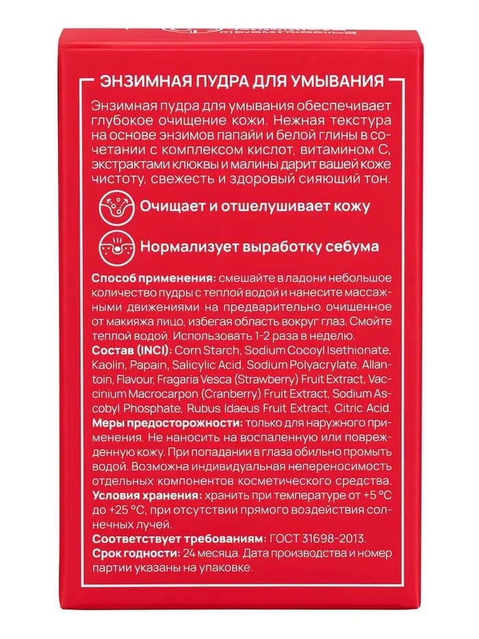 Состав: Corn Starch, Sodium Cocoyl Isethionate, Kaolin, Papain, Salicylic Acid, Sodium Polyacrylate, Allantoin, Flavour, Fragaria Vesca (Strawberry) Fruit Extract, Vaccinium Macrocarpon (Cranberry) Fruit Extract, Sodium Ascobyl Phosphate, Rubus Idaeus Fruit Extract, Citric Acid.