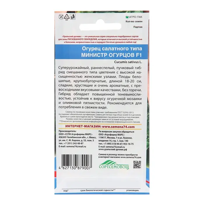 Огурец Министр Огурцов F1 — Суперурожайный, раннеспелый, пучковой гибрид смешанного типа цветения с высокой насыщенностью женскими узлами. Плоды белошипые, крупнобугорчатые, длинной 18-20 см, сладкие,хрустящие и очень ароматные, с превосходными вкусовыми качествами,без горечи. Гибрид обладает повышенной теневыносливостью, устойчив к вирусу огуречной мозаики и оливковой пятнистости. Рекомендуется для потребления в свежем виде. Прямой посев производится в прогретую почву, обычно в конце мая начале июня, глубина заделки семян не более 1,5-2 см. Плотность посадки в открытом грунте 4-5 растений, в теплицах 2-3 растения на 1 кв.м. Возраст рассыды при рассадном способе выращивания, перед посадкой должен составлять 20-30 дней. Последующий уход заключается в регулярном поливе теплой водой, после захода солнца, прополке, рыхлении и подкормки.