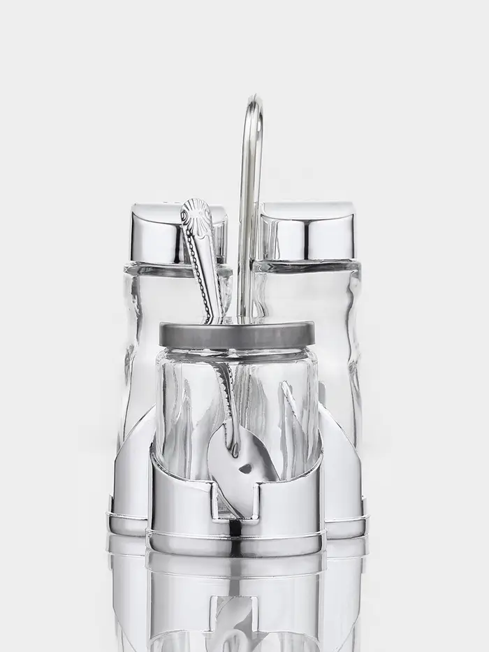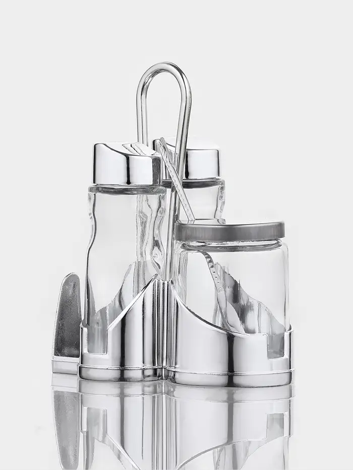 - Удобное сочетание: в набор входят сахарница с ложкой, солонка и перечница, что делает его универсальным решением для любых приемов пищи.