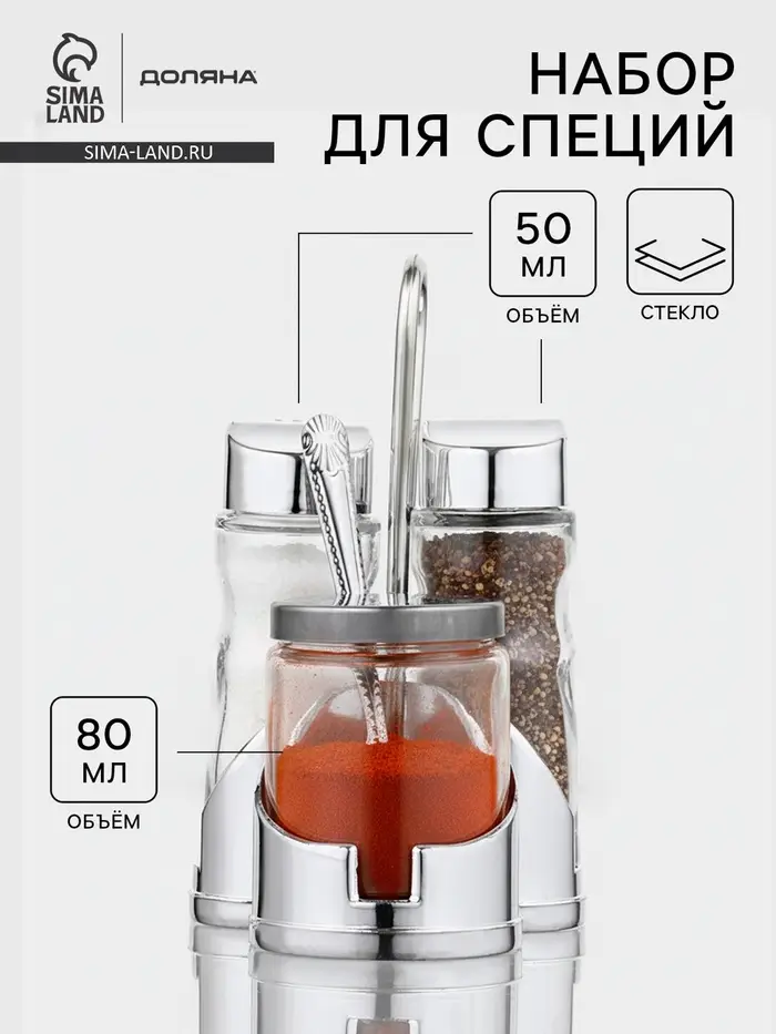 Набор для специй Доляна «Стиль», 3 предмета: сахарница с ложкой 80 мл, солонка и перечница 50 мл, подставка-салфетница, стекло, прозрачный