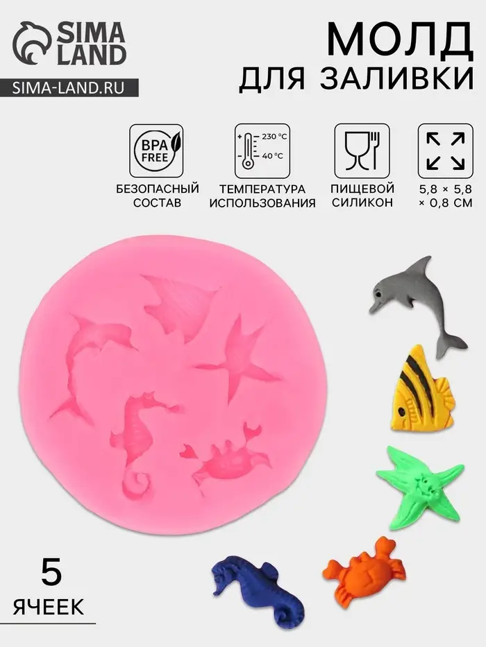 Молд для заливки «Морские обитатели», силикон, 5 ячеек,5.8×0.8 см, розовый