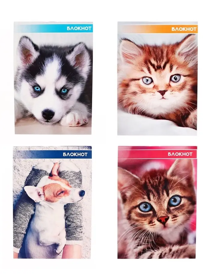Набор блокнотов А6 40л кл на скобе Котята и щенята, мел карт, 4В 20шт