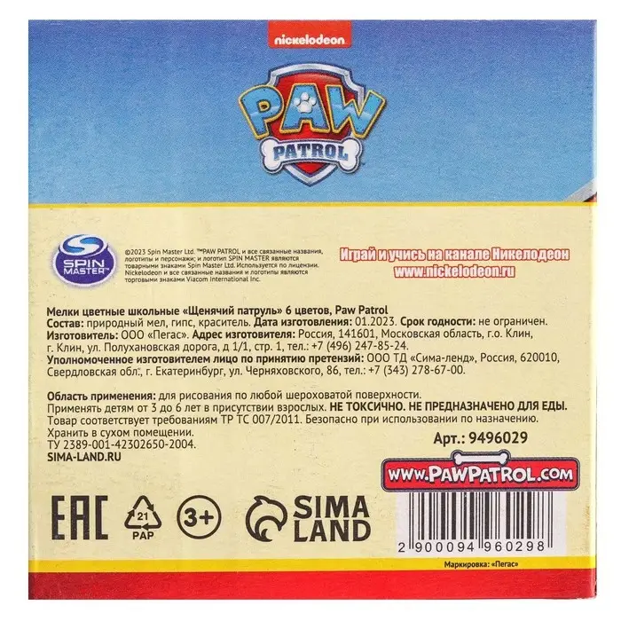 Мелки цветные школьные 6 шт. «Щенячий патруль», прямоугольные