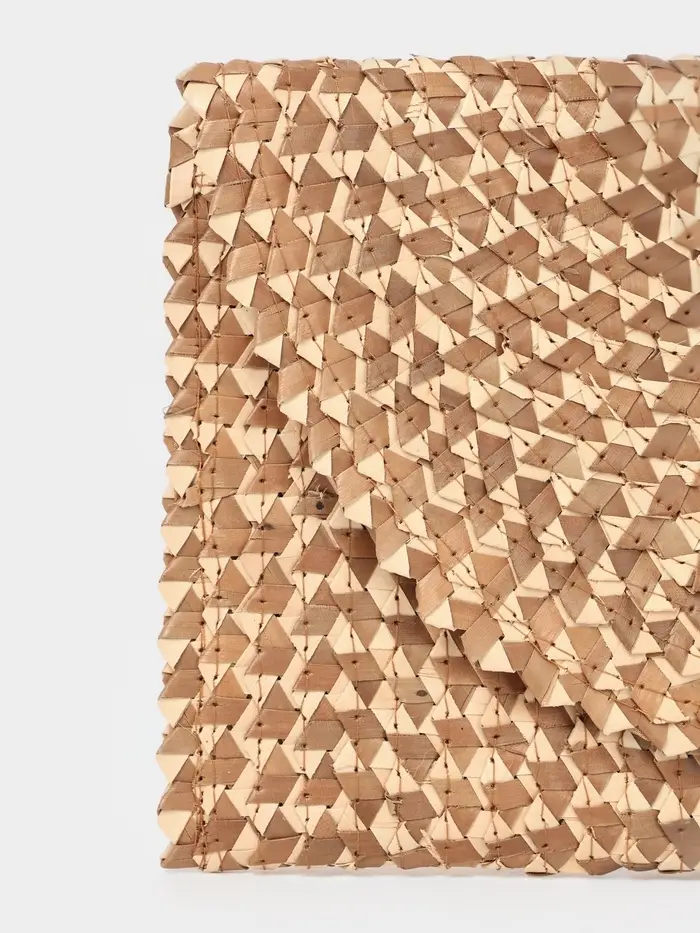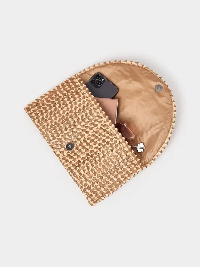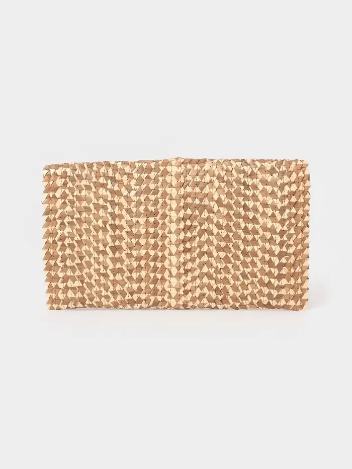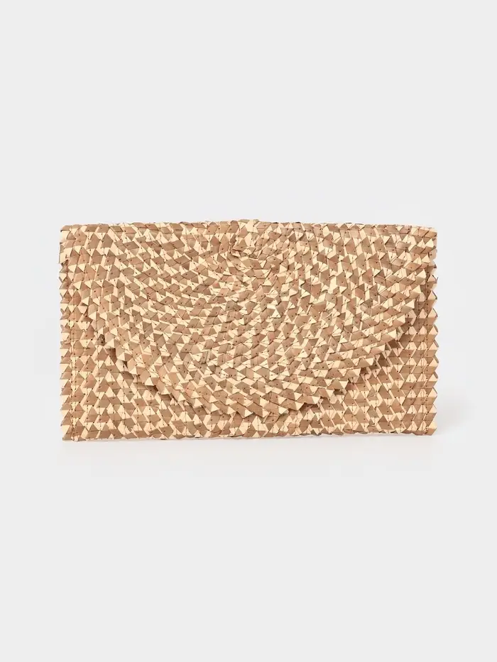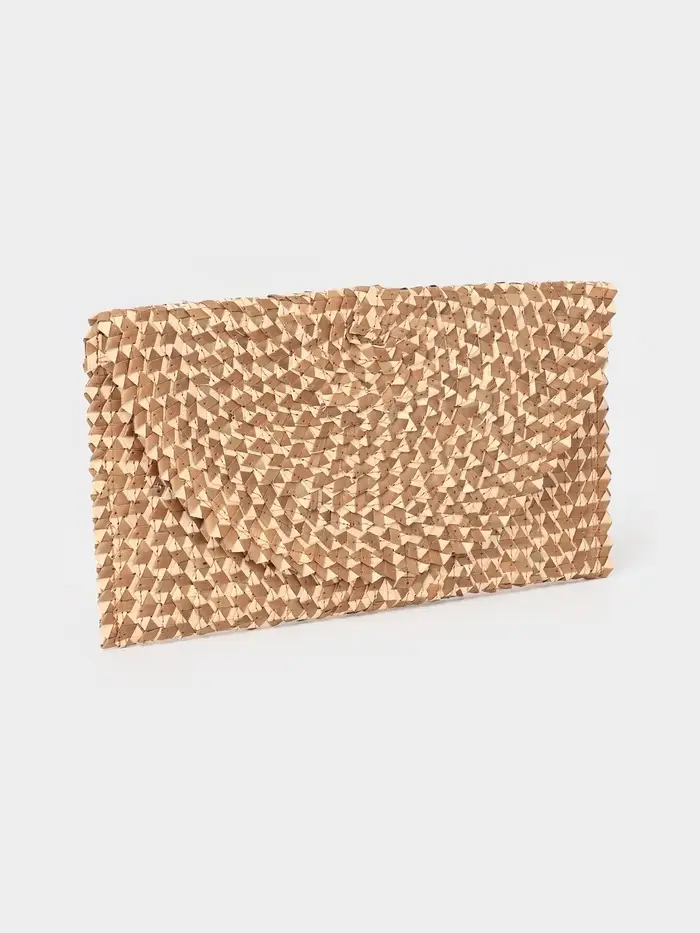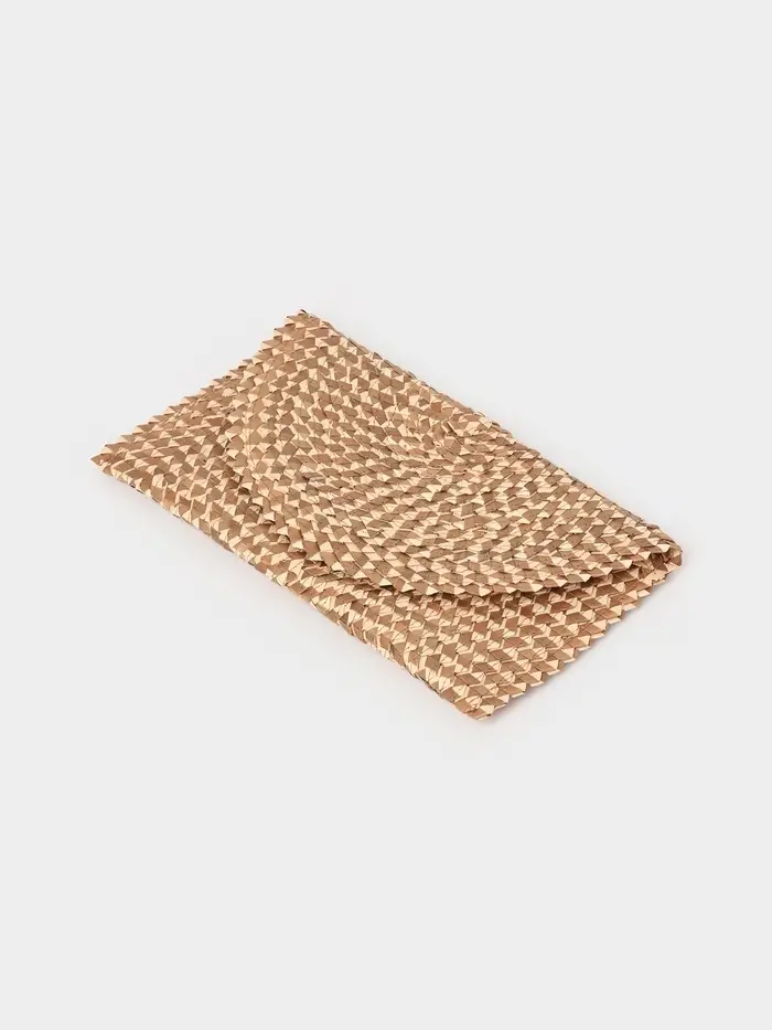 Клатч из натурального пальмового листа золотистого оттенка. Универсальный размер 28×16×2 см подходит для повседневного использования. Элегантная магнитная застёжка и мягкий каркас обеспечивают удобство ношения. Природные материалы и золотая фурнитура создают стильный образ.