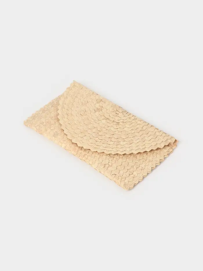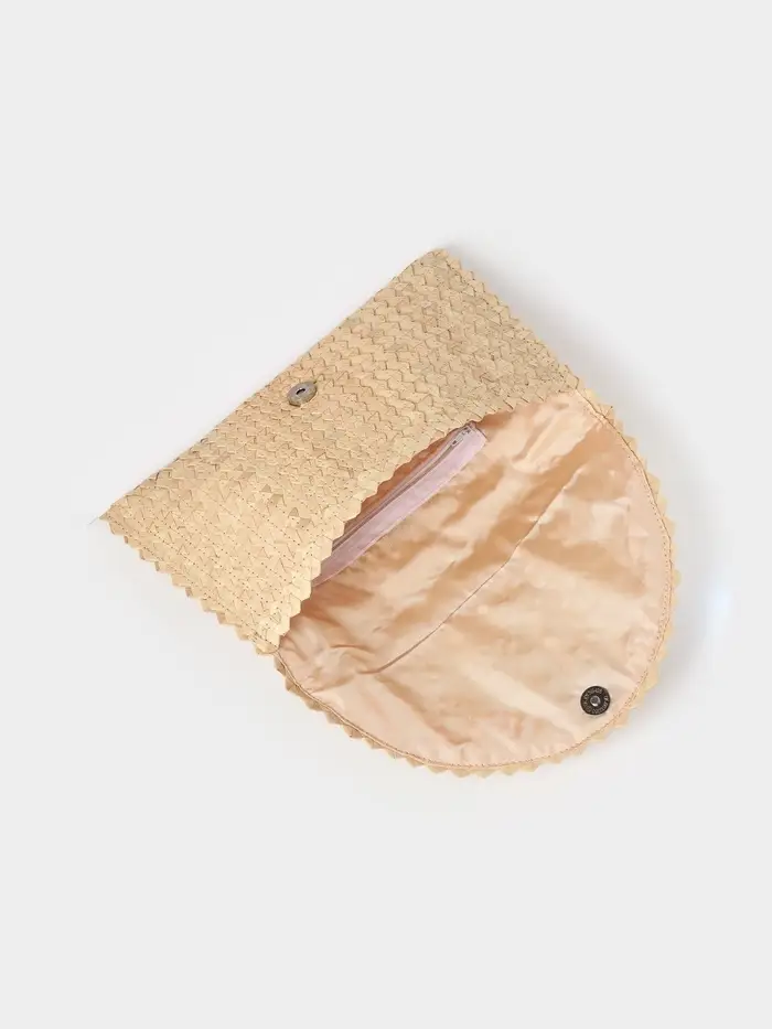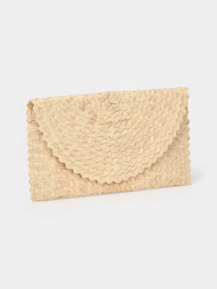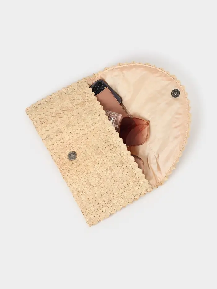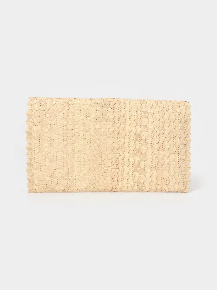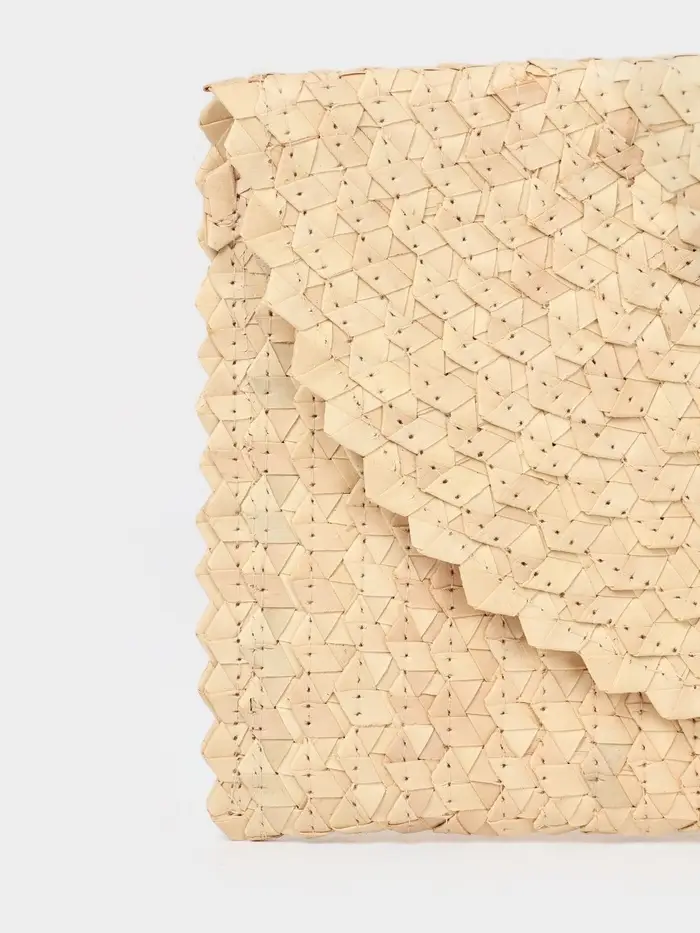 Клатч из натурального пальмового листа нежного бежевого оттенка. Универсальный размер 28×16×2 см подходит для повседневного использования. Элегантная магнитная застёжка и мягкий каркас обеспечивают удобство ношения. Природные материалы и фурнитура бежевого цвета создают элегантный образ.