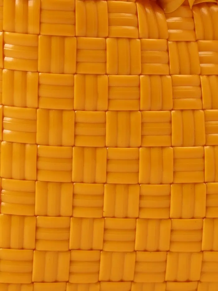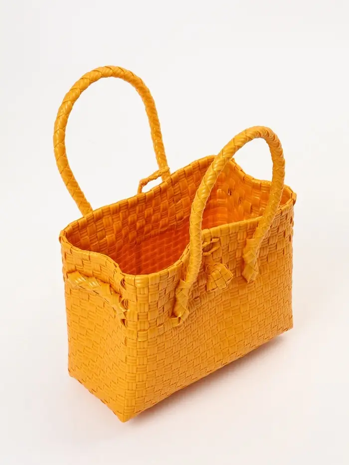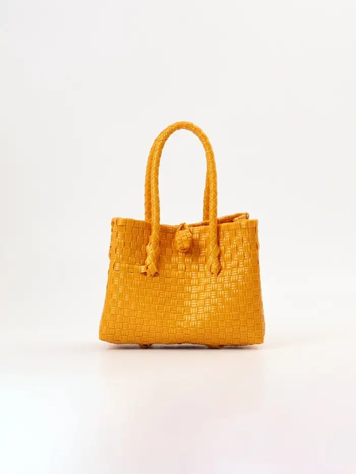 Плетёная пластиковая сумка яркого жёлтого цвета. Компактный размер делает её идеальным летним аксессуаром. Застёжка на пуговицу обеспечивает быстрый доступ к необходимым вещам. Лёгкая и прочная конструкция из пластика.