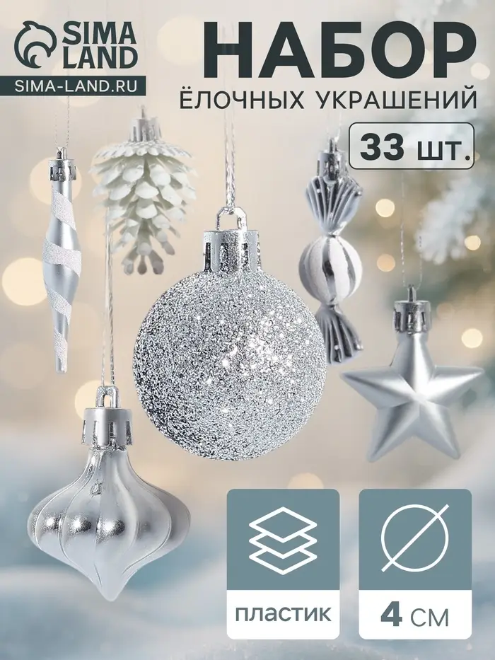 Набор серебристых ёлочных шаров из 33 пластиковых украшений диаметром 4 см подходит для создания элегантного и светлого акцента в праздничном декоре. Резные узоры и однотонное покрытие формируют композицию, которая сочетает простоту и блеск, подчёркивая зимнюю атмосферу и традиции.