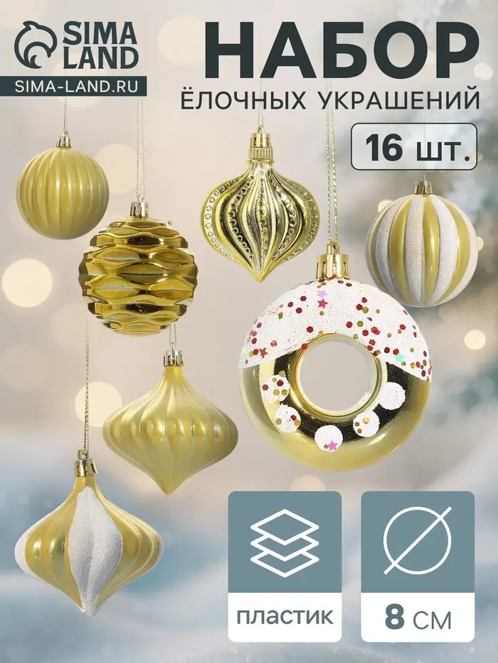 Ёлочные игрушки набор 16 шт. «Ярмарка волшебства» 8 см, золото