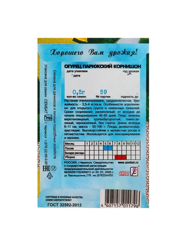 Культура тепло- и влаголюбива, размещают на освещенных, защищенных от холодных ветров местах. Почвы — легкие, плодородные, богатые гумусом. Посев сорта огурцов в необогреваемые теплицы и в грунт семена либо 20-25 дневную рассаду сажают в конце мая. Семена начинают прорастать при 13-15°С, оптимальная температура для развития 25-З0°С . Глубина посадки семян 1.5-2 см. Грунт должен быть плодородным с высокой аэрированием (добавить опилки, листья). Необходимы систематические поливы теплой водой. Раз в десять дней полив сочетают с подкормкой (один литр навоза либо десять граммов мочевины на десять литров воды). Нужно пропалывать грядки от сорняков и рыхлить почву. Рыхление можно заменить мульчированием. Подкормки проводят органическими и минеральными удобрениями. Развивают растение путем прищипки над 3-м листом. Срывать зеленцы нужно осторожно, чтоб не повредить растение и не предотвратить повторный урожай.