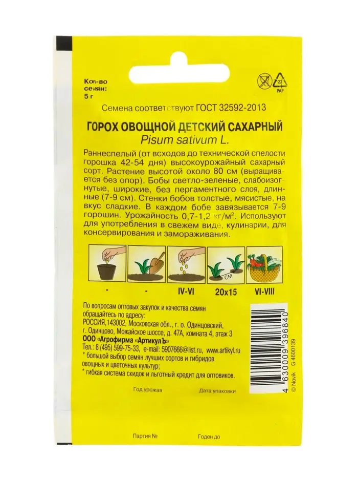Семена Горох овощной «Детский Сахарный», раннеспелый, 5 г, «Артикул»