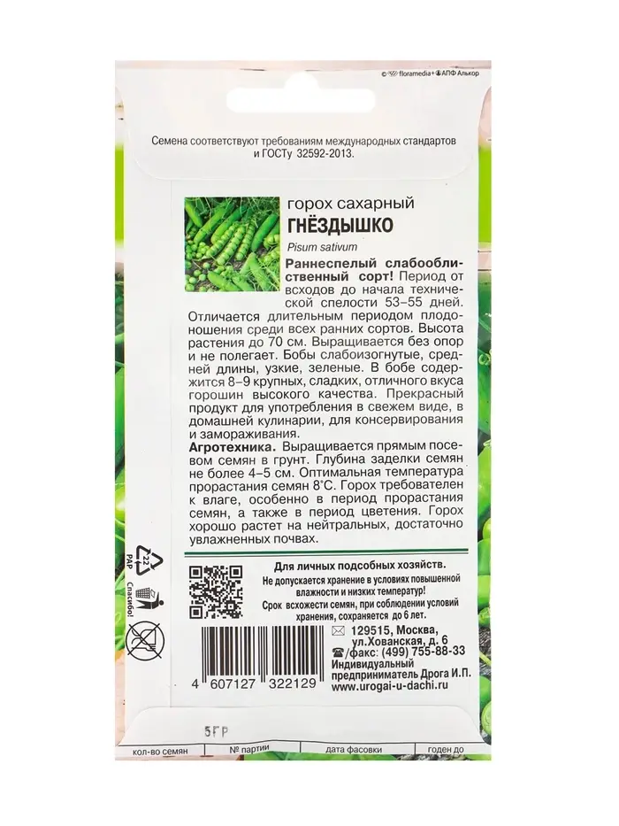 Раннеспелый слабооблиственный сорт! Период от всходов до начала технической спелости 53-55 дней. Отличается длительным периодом плодоношения среди всех ранних сортов. Высота растения до 70 см. Выращивается без опор и не полегает. Бобы слабоизогнутые, средней длины, узкие, зеленые. В бобе содержится 8-9 крупных, сладких, отличного вкуса горошин высокого качества. Прекрасный продукт для употребления в свежем виде, в домашней кулинарии, для консервирования и замораживания. Выращивается прямым посевом семян в грунт. Глубина заделки семян не более 4-5 см. Оптимальная температура прорастания семян 8?С. Горох требователен к влаге, особенно в период прорастания семян, а также в период цветения. Горох хорошо растет на нейтральных, достаточно увлажненных почвах.