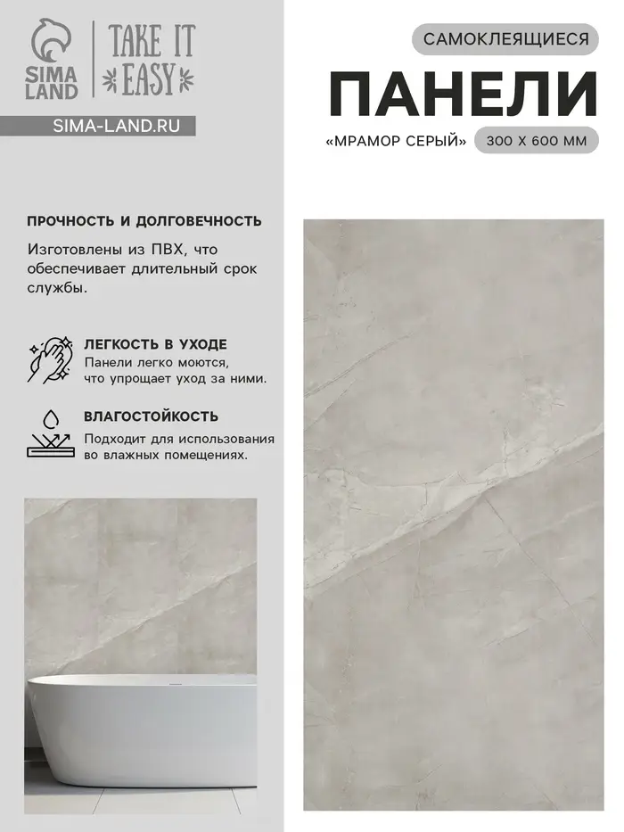 Стеновая панель самоклеящаяся TAKE IT EASY, 300×600 мм, цвет мрамор серый, 10 шт.