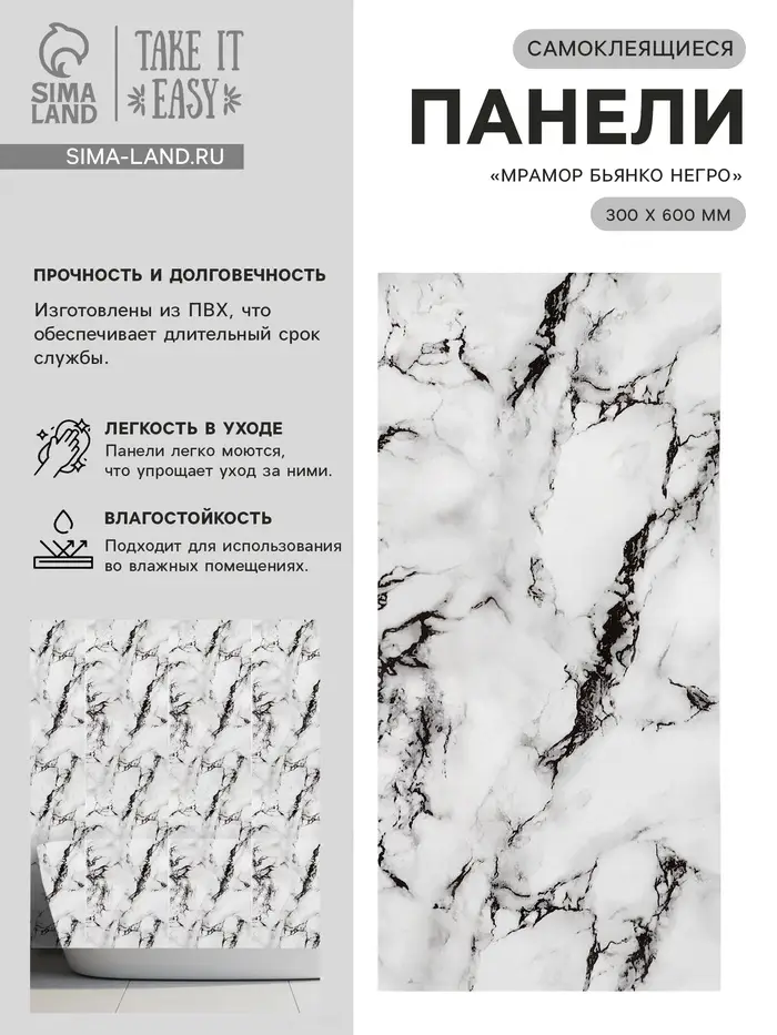 Стеновая панель самоклеящаяся TAKE IT EASY, 300×600 мм, цвет мрамор бьянко негро, 10 шт.