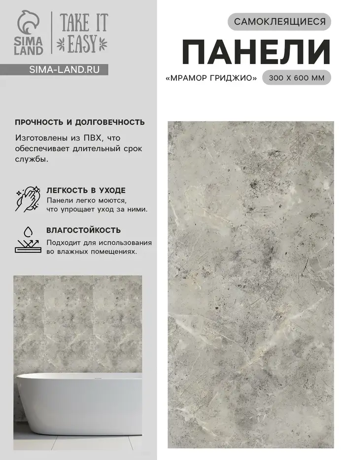 Стеновая панель самоклеящаяся TAKE IT EASY, 300×600 мм, цвет мрамор гриджио, 10 шт.